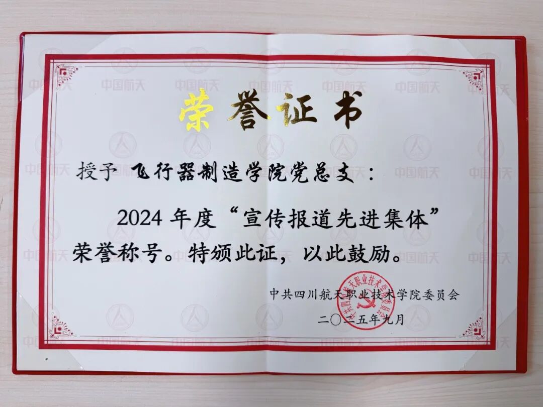近日,四川航天职业技术学院2024年度宣传工作总结表彰结果揭晓,飞行器制造学院党总支荣获“宣传报道先进集体”荣誉称号,学院张皓南老师荣获“优秀通讯员”荣誉称号。此次荣誉的获得,是对飞行器制造学院宣传思想文化工作的充分肯定。