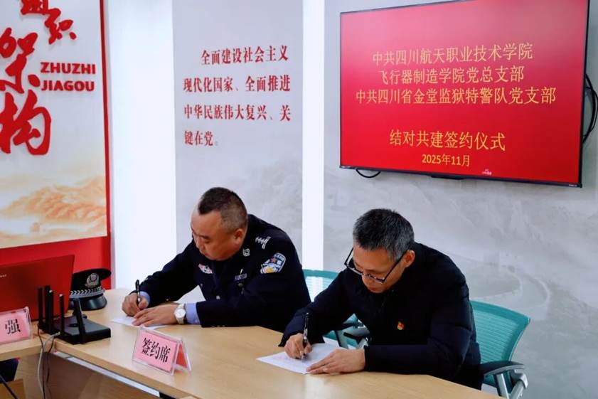 随后,双方支委召开党建结对共建会议。金堂监狱特警队党支部书记谭远斌首先介绍金堂监狱特警队党支部基本情况和取得的成绩;飞行器制造学院党总支书记徐锐从学院专业设置、人才培养、服务航天、服务地方低空经济等方面介绍学院党建与业务融合成效。双方共同审议并签署《党建结对共建协议》,明确将在警示教育、志愿服务、禁毒防艾、法治宣传、低空经济科普等领域开展深度合作,实现资源共享、优势互补。