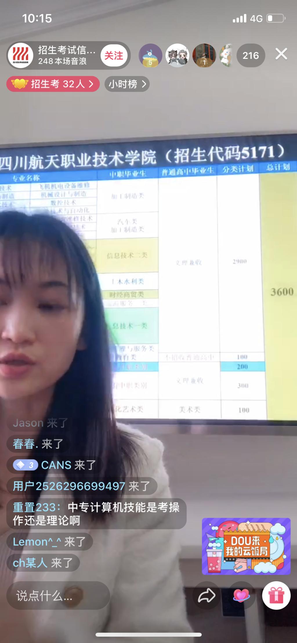 招生处陈思娟老师早早在抖音直播间等候,早上九点半,直播正式开始。绝大部分的考生和家长都是第一次利用观看直播的方式咨询招生,感到非常新鲜和兴奋。陈老师介绍了学院的办学特色、地理位置、单招方案、专业设置、国际合作、就业优势等方面的内容,直播时长达1个小时。她用幽默的语言与考生拉近距离,鼓励考生大胆填报我院。考生们都积极留言提问,陈老师就考生提出的学历提升、资助政策、就业前景、专业设置情况进行了系统全面的回答。直播间的考生们纷纷表示成为了四川航天职业技术学院和陈老师的粉丝。