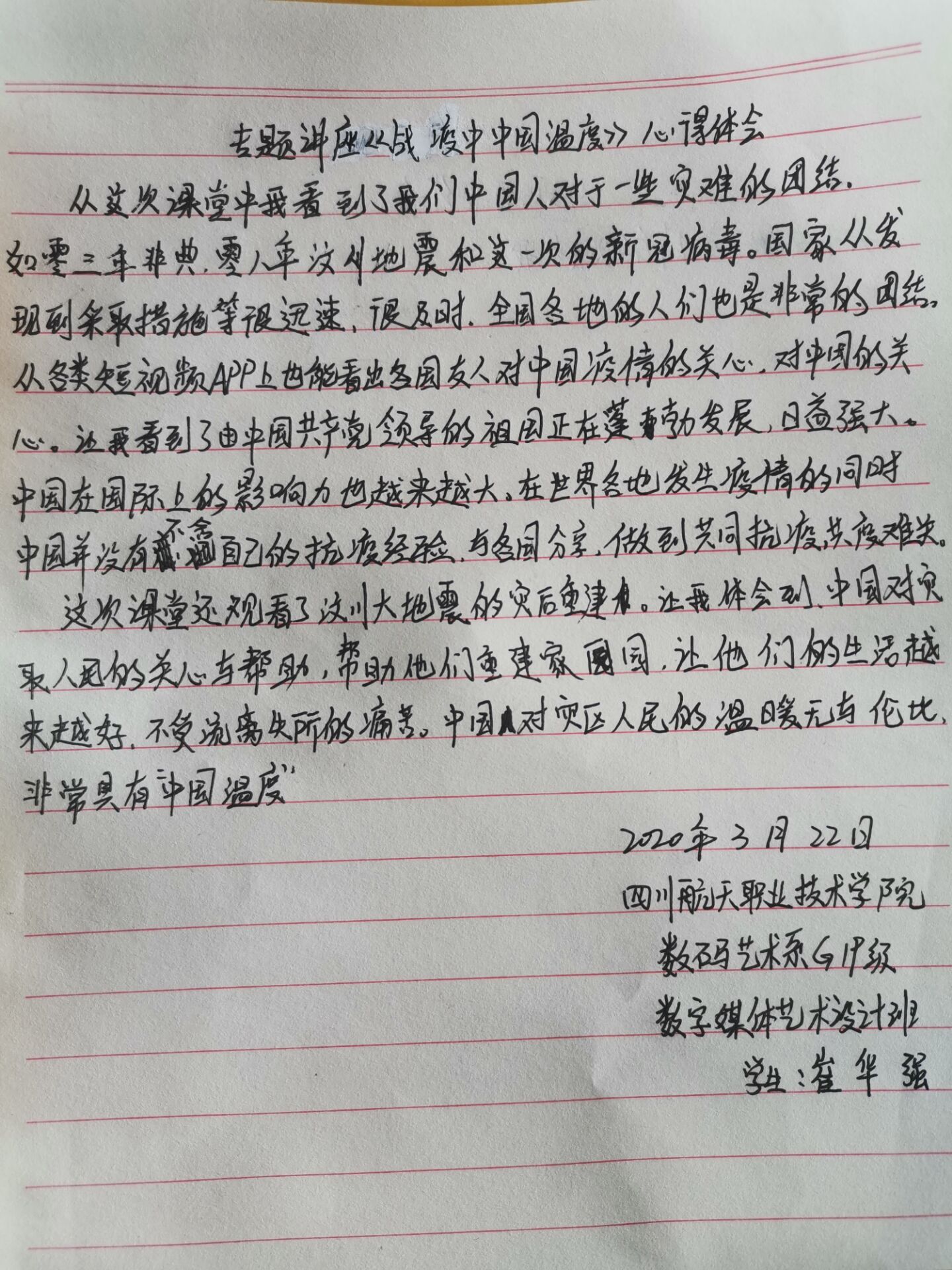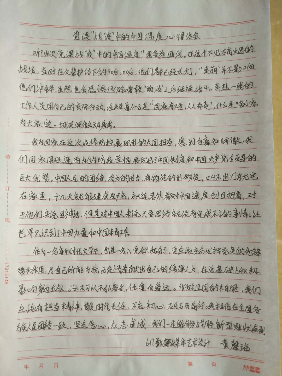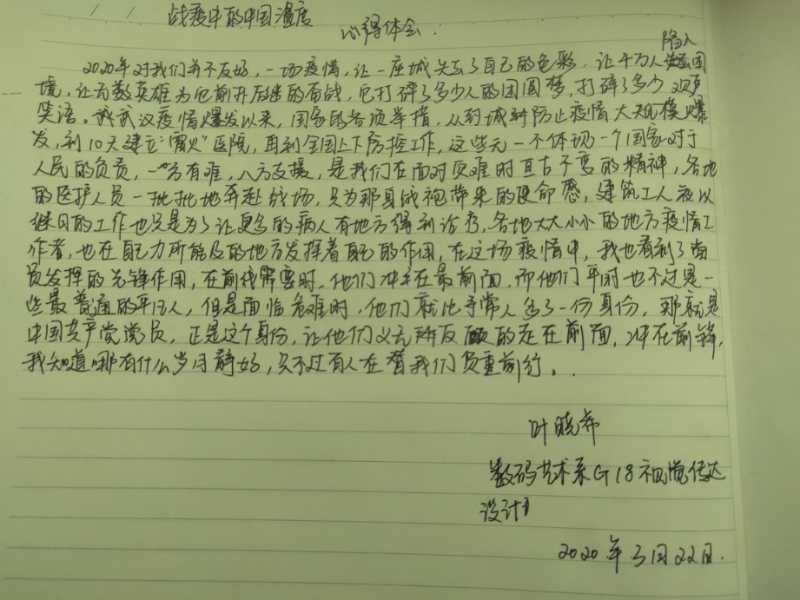 杨祖峰:今天听完党课后,让我感受到了中国的温度,作为中国人,骄傲自豪。同时也看到在这次防疫阻击战中涌现出了很多优秀的共产党员,他们有白衣执甲的医生护士,有义务为社区居民送包裹的“跑腿哥”,还有坚守一线防疫消毒的志愿者,他们都是最美的逆行人。我将以防疫一线优秀党员同志为榜样,立足本职岗位,为学院的发展做出自己的一份贡献。