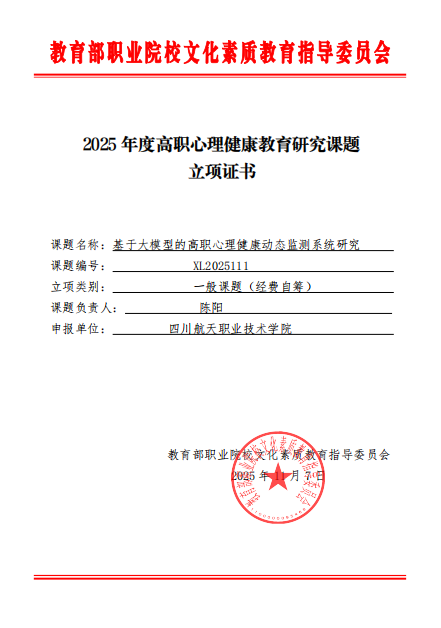 近日,教育部职业院校文化素质教育指导委员会公布2025年度高职心理健康教育研究课题立项名单,我校计算机学院教师陈阳主持申报的《基于大模型的高职心理健康动态监测系统研究》课题成功获批立项。这一课题的立项,标志着我校在高职心理健康教育领域迈出了坚实的一步,展现了我校科研团队在该领域的专业实力与创新精神。
