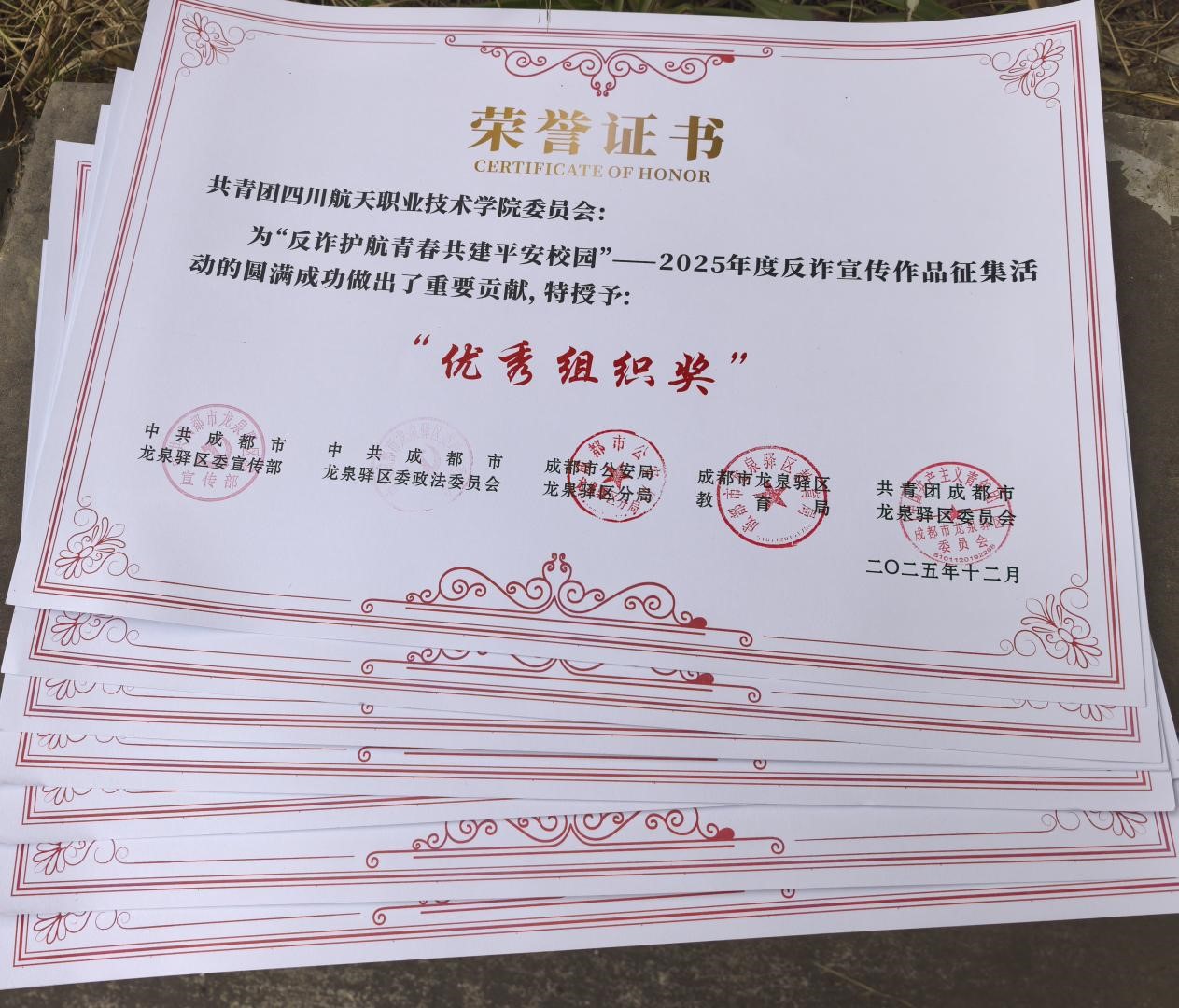 近日,由中共成都市龙泉驿区委宣传部、区教育局、共青团龙泉驿区委员会等部门联合主办的“反诈护航青春 共建平安校园”2025年度反诈宣传作品征集活动圆满收官。我校学子在此次活动中表现卓越,斩获多项荣誉,充分彰显了我校学生的创新思维、社会责任感和扎实的专业实践能力。