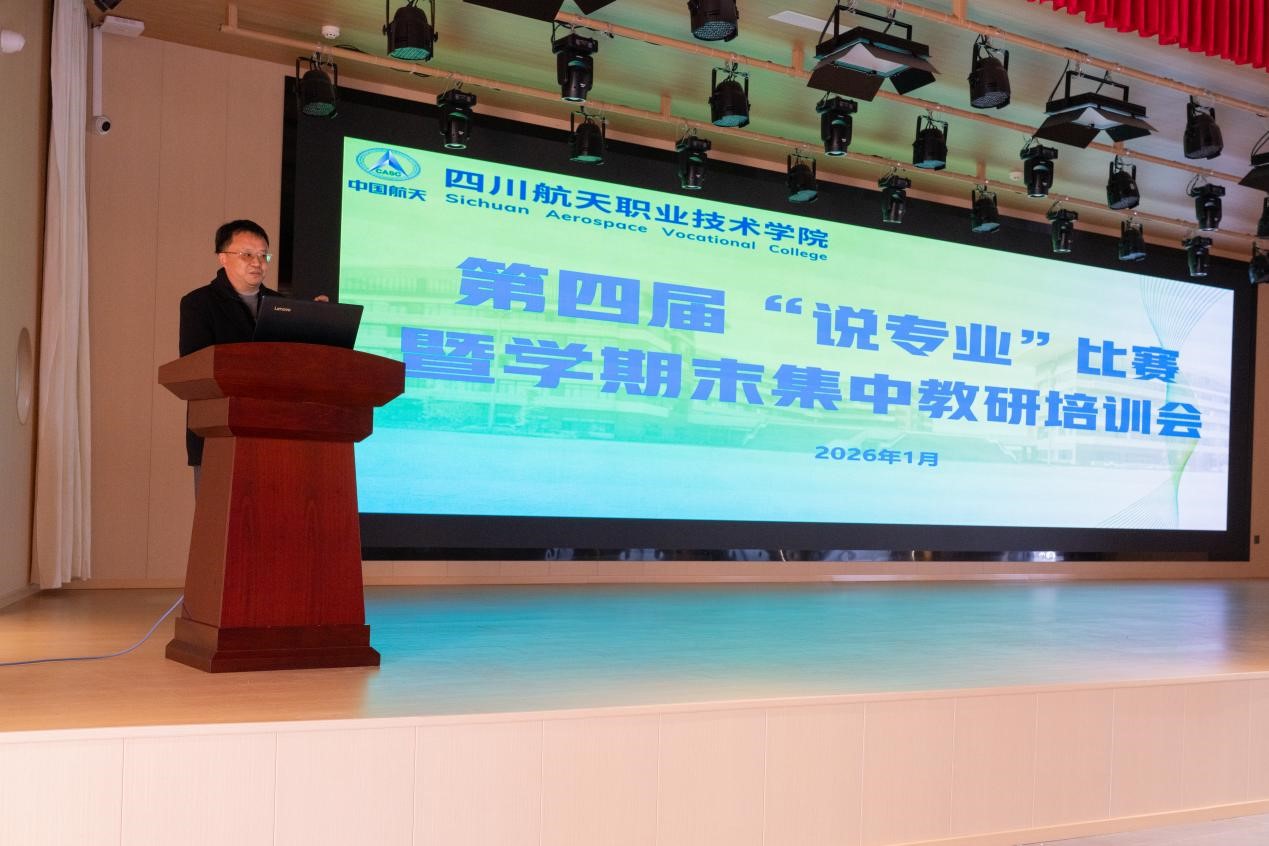 1 月14日,四川航天职业技术学院第四届“说专业”暨学期末集中教研培训会在知行楼B区学术报告厅举行。活动聚焦“双高计划”政策落地与专业质量提升,分为“说专业”比赛、专题培训两大环节,活动上半场由教学副校长周林主持,下半场由教务处处长李涛主持。活动特邀四川省教育科学研究院及四川省教育评估院的两位专家莅临现场,既担任比赛评审,又作专题授课;校内5位二级学院院长协同组成评委团,全校骨干教师共同参与了此次活动。