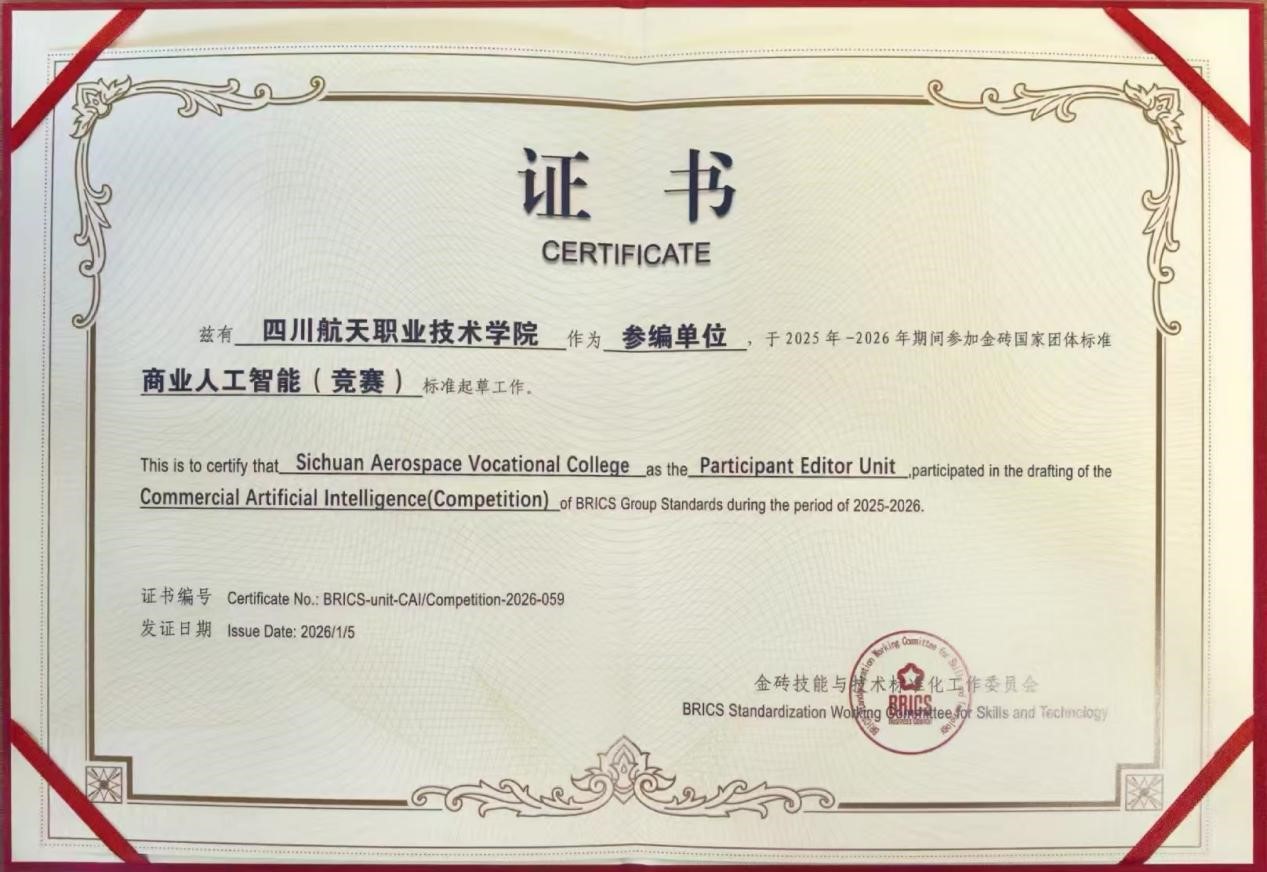 作为参编单位,四川航天职业技术学院计算机学院将充分发挥在人工智能领域的专业优势,深度参与“商业人工智能(竞赛)”标准中课程体系、技能认证及竞赛评价等关键环节的研讨与制定工作。此次参编不仅是我院服务国家“一带一路”倡议、深化产教融合的具体行动,也是提升学院国际化办学水平、增强在国际职业教育领域话语权的重要契机。