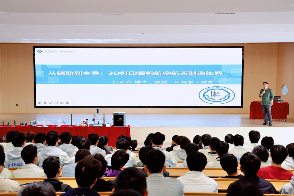 围绕3D打印在航空航天制造体系中的角色演变,门教授将其划分为辅助制造、并行制造、主导制造三个阶段,并结合国内外前沿案例,阐释了各阶段的技术特征与产业影响。他强调,随着材料体系、工艺控制、检测标准等关键技术的持续突破,3D打印正由制造体系中的辅助环节逐步迈向主导地位,成为推动航空航天制造转型升级的重要力量。讲座最后,门教授展望了增材制造技术在太空制造、智能结构一体化成型等未来场景中的广阔前景,勉励同学们把握技术变革机遇,夯实专业基础,积极投身航空航天高端制造领域。