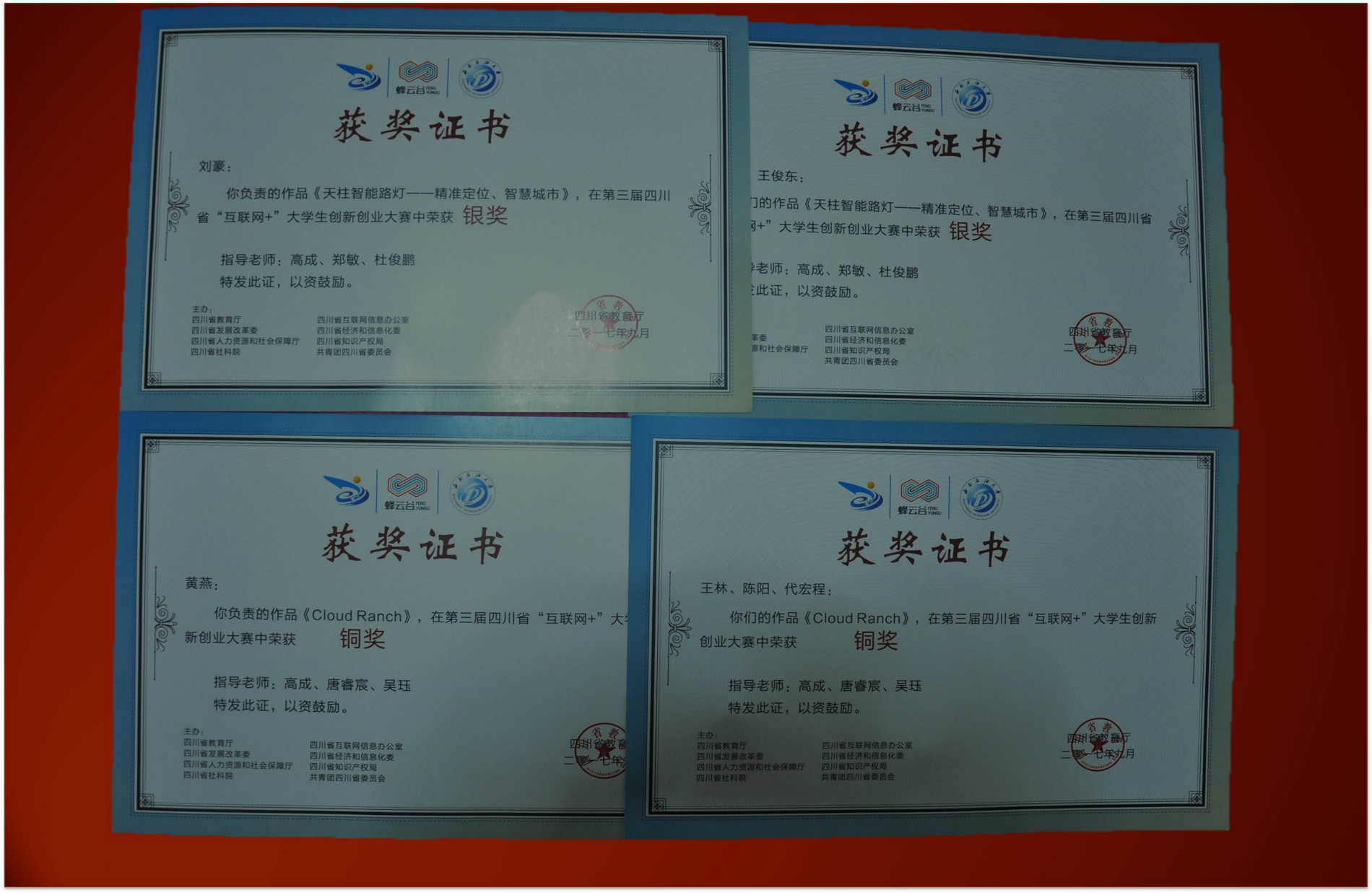本次由学院陈宇副院长带领科研处王立波处长、王银老师携获奖团队指导教师和获奖学生参加了颁奖典礼,管理工程系高成老师指导的2个参赛项目获得奖项,其中G15市场班刘豪、王俊东《天柱智能路灯—精准定位、智慧城市》项目获创意组银奖,G16市场班黄燕、陈阳、王林、代宏程《CLOUD RANCH》项目创意组铜奖。