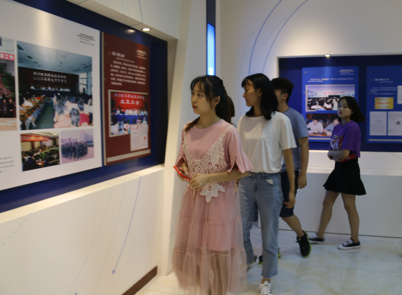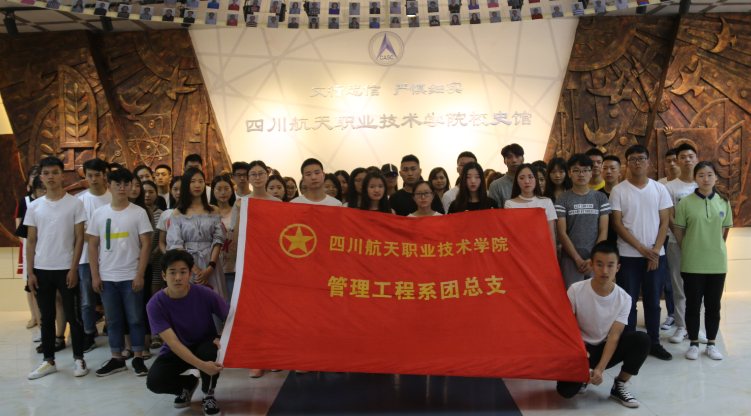 全体成员有序进入校史馆,在学院优秀辅导员“蓝天白云”的照射下满怀热忱的参观学校辉煌历程。从1965年四川航天工业学校到如今的2018年的四川航天职业技术学院,半个世纪的求索奠定了今日之基础;看着一项比一项伟大的成就,燃起学子心中的航天情怀;看着一代又一代航天教育者艰苦奋斗泛黄的照片,让同学们激昂万分。