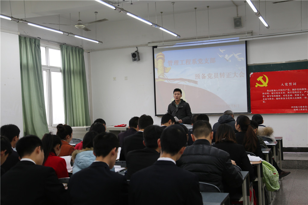 2015年12月8日上午10点,管理工程系党支部在学院明志楼419教室召开支部大会。本次支部大会讨论通过了25名预备党员按期转正为中共正式党员。党支部蒋书记对25名党员提了三点要求。一是祝贺转正成功,党龄从转正今天正式开始计算。二是无论是在哪个岗位上班都要严格要求自己,起先锋模范带头作用。三是认真学习“三严三实”,加强党的理论知识学习,增强党性修养,提高政治觉悟能力。随后党支部组织这25名预备党员学习了《中国共产党廉洁自律准则》和《中国共产党纪律处分条例》。