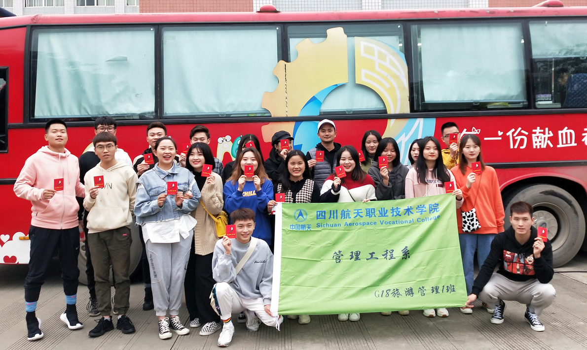 2019年10月31日为响应广汉市献血服务中心宣传,G18旅游管理1班团支部在辅导员徐权铃老师的带领下,21名符合献血要求的同学献出了属于自己的一份爱心。