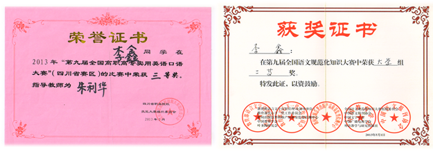 刚进入大学的时候,我便迫不及待的加入了“晨读队”。这是一个充满爱的团体,每天早上我们都会近乎疯狂地喊到:我的左脚,我的右脚,啊,这是一个多么美好的一天啊,充满着爱,热情,效益,感恩,power!在大二的时候,我非常幸运地被老师推荐去参加院“英语口语”比赛,在初赛中获得学院“第一名”, 2013年5月,代表学院参加并获得了四川省高职高专实用英语口语复赛“三等奖”;在第九届全国论文“浅析规范字与普通话的现状与对策”大赛中荣获一等奖。但是我不想就此罢休,一直努力着想让自己的大学生活过得更加的丰富和有意义。于是在大二结束的暑假期间,我很幸运的参加了由院主办的“赴美带薪实习”活动,有幸前往美国,去感受异域风情,去开拓视野,希望以此来提升自己的综合能力。在这为期四个月的异国实习经历中,我结交到了不少外国友人,对于不同文化之间的相互碰撞和交流,也培养了我一定的国际视野,实乃人生中的一大财富。