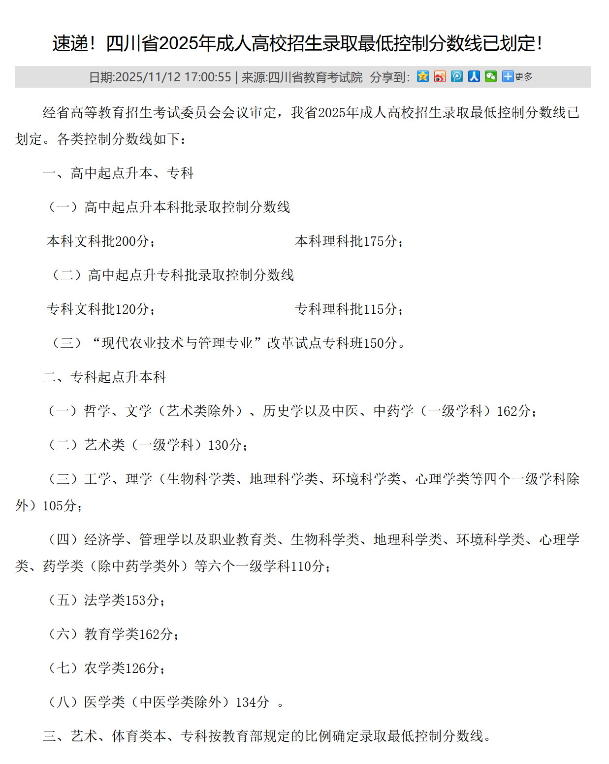 转载四川省教育考试院-四川省2025年成人高校招生录取最低控制分数线已划定!