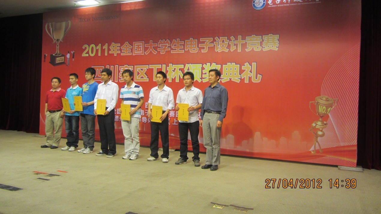 2011年全国大学生电子设计竞赛-四川赛区的颁奖典礼 于2012年4月27日,在成都电子科技大学隆重举行。与会的主要领导有:四川省教育厅的领导,中国科学院士,电子科技大学领导,TI公司亚太地区负责人,大赛组委会专家,40余所川内高校教师代表与获奖学生代表。 我校五支参赛队全部获奖:全国一等奖一个、二等奖一个;四川省一等奖两个、二等奖一个、三等奖两个。我校还获得优秀组织奖,李彬获优秀指导教师奖。典礼上最后是颁发的是本次竞赛的最高奖项“TI杯”,获此殊荣的仅有我校与成都电子科大学。