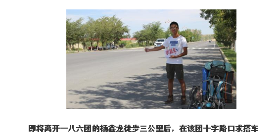 2015年8月10日,杨鑫龙从老家四川阆中市出发徒步到广元市开启了他的旅行计划。途中每天至少步行15公里,在好心司机的帮助下,搭上顺风车从甘肃兰州、张掖、嘉峪关、新疆哈密、乌鲁木齐、石河子、布尔津一路向前,途经12省份。