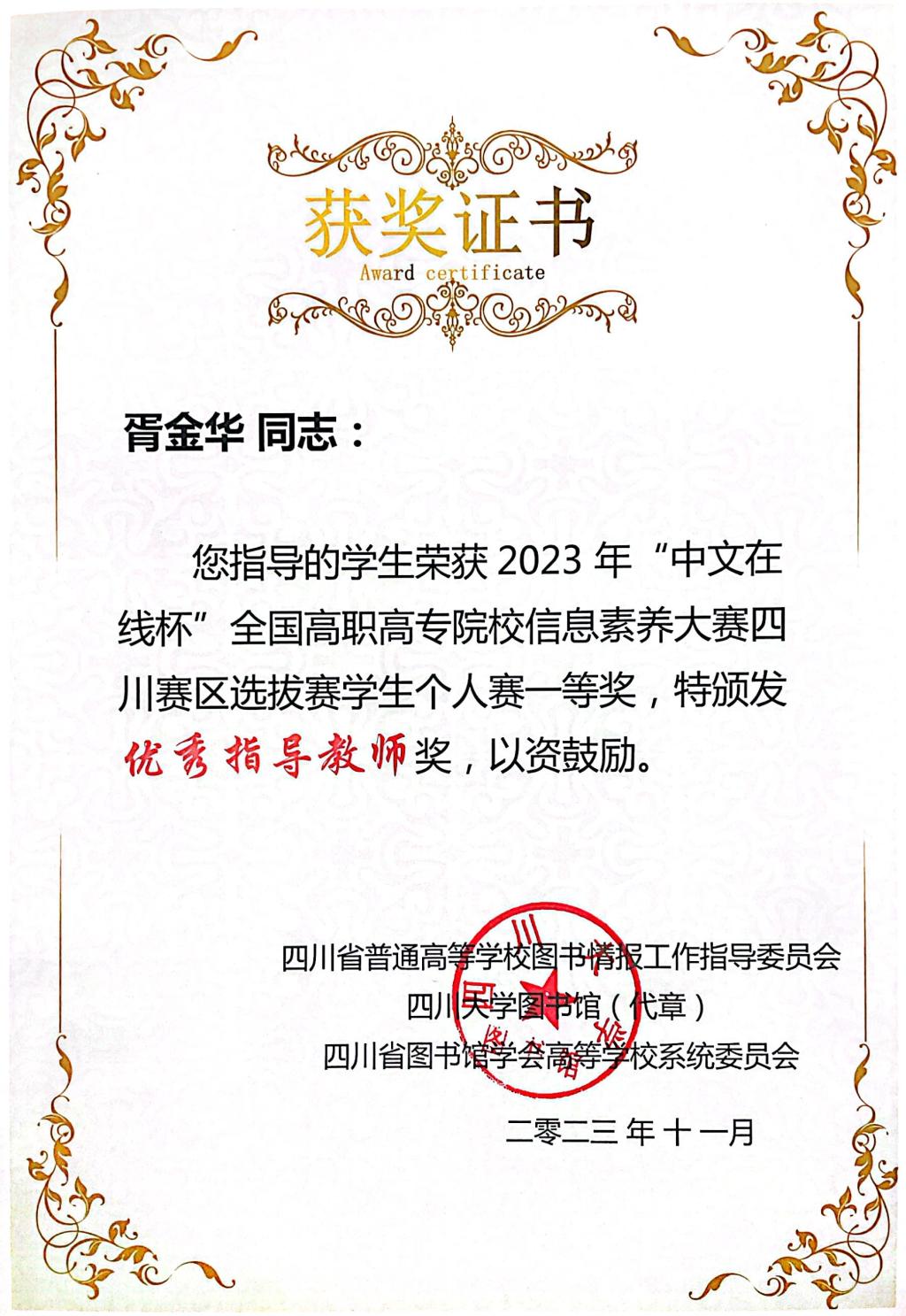 由四川省普通高等学校图书情报工作指导委员会、四川省图书馆学会高等学校系统委员会主办,四川省图书馆学会高校系统委员会高职分会、成都航空职业技术学院承办的2023年“中文在线杯”全国高职院校信息素养大赛四川赛区选拔赛(以下简称大赛)圆满结束。学校获得一等奖2个,二等奖3个,三等奖2个,胥金华、王丽娜、蒋昔谋获得优秀组织教师奖,蒋昔谋获得教师微课赛省二等奖。同时学校获得最佳组织奖。